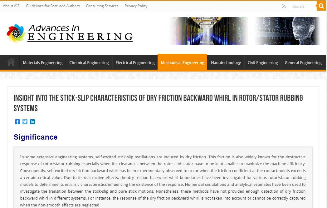 AIE报道链接://advanceseng.com/stick-slip-characteristics-dry-friction-backward-whirl-rotor-stator-rubbing-systems/