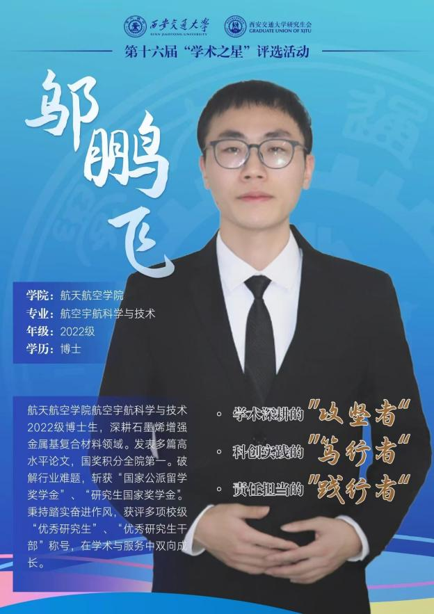 2022级航空宇航科学与技术专业博士研究生邬鹏飞荣获“学术之星”称号及“最佳人气奖”。本次活动由研究生院、团委主办,校研究生会承办,以“研途逐梦启新程,学术之星耀百卅”为主题,旨在树立学术典范,彰显我校研究生的卓越风采,激励广大学子见贤思齐、笃行致远。